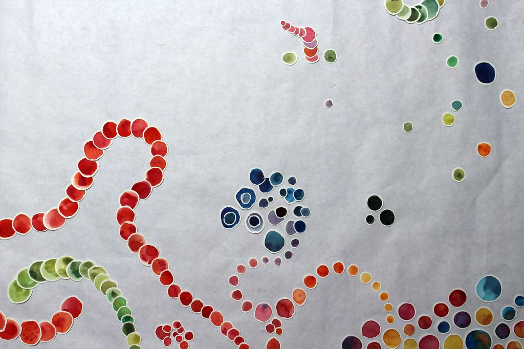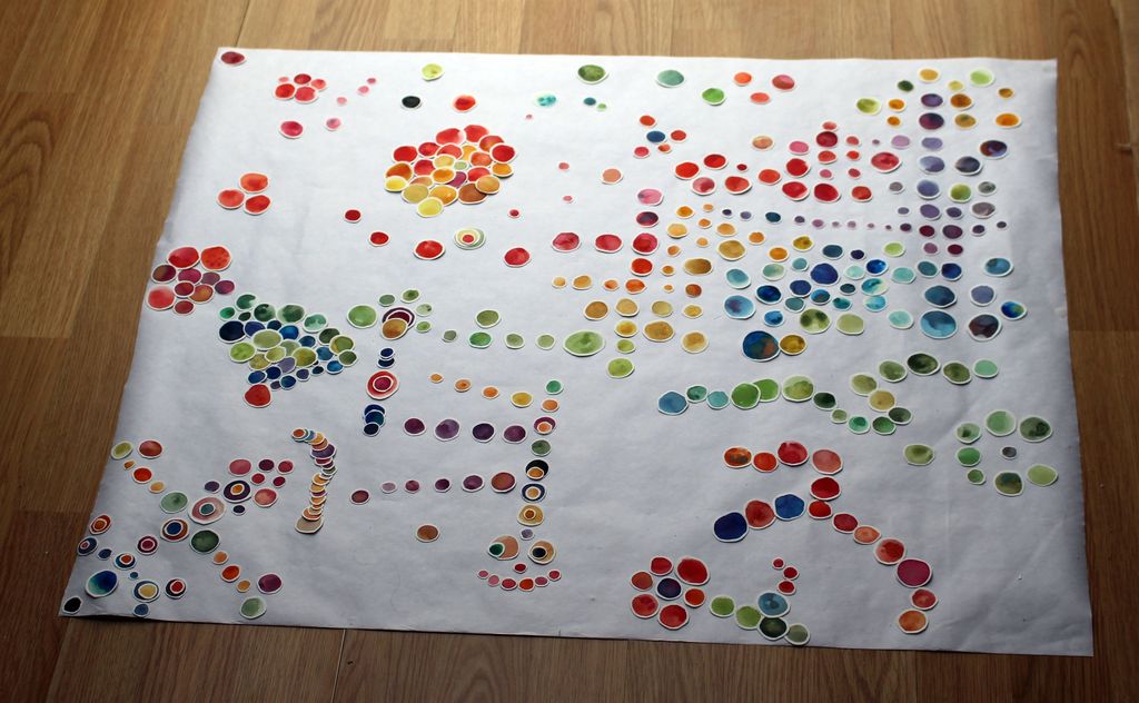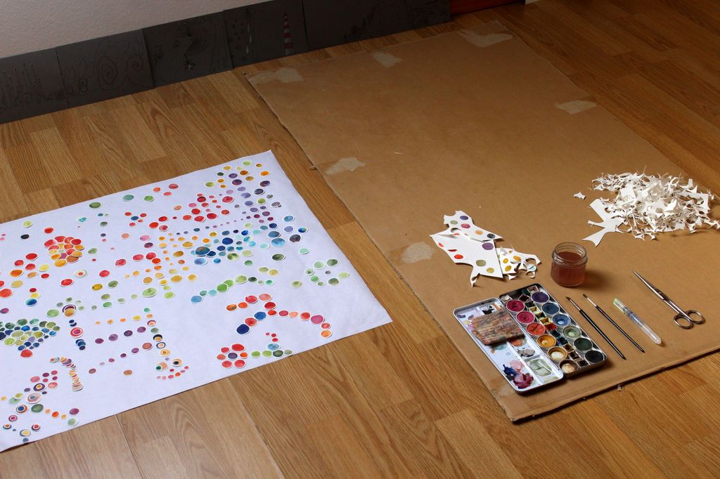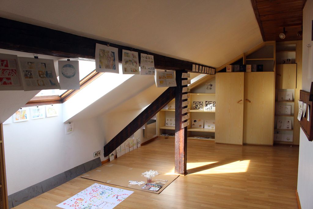 C’était mon truc préféré ! Merci aux participant.e.s pour le découpage, le dessinage et vos amusements avec les petits ronds. J’étais tellement fan, que je l’ai encore laissé 2 jours après la fin de l’exposition.