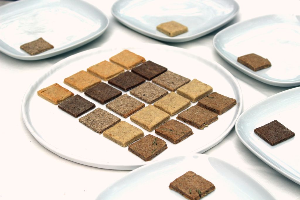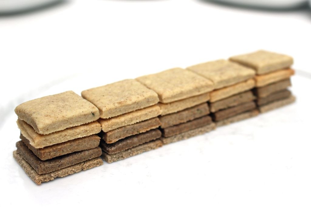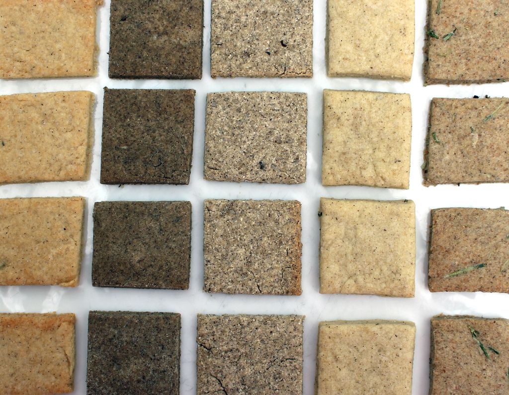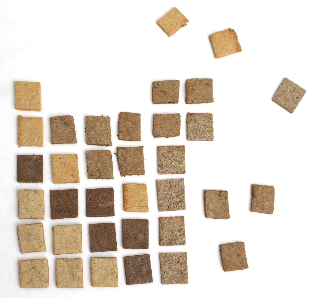 Malaxer la pâte, faire différents essais. Découper des carrés. Les faire cuire. Jouer avec les carrés. Imaginer faire un immense nuancier comestible sur une très grande table avec beaucoup plus de couleurs que les nuances ficelles ! J’adore tout ça.