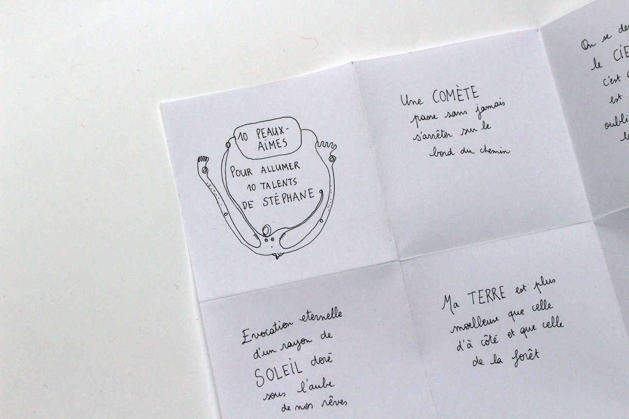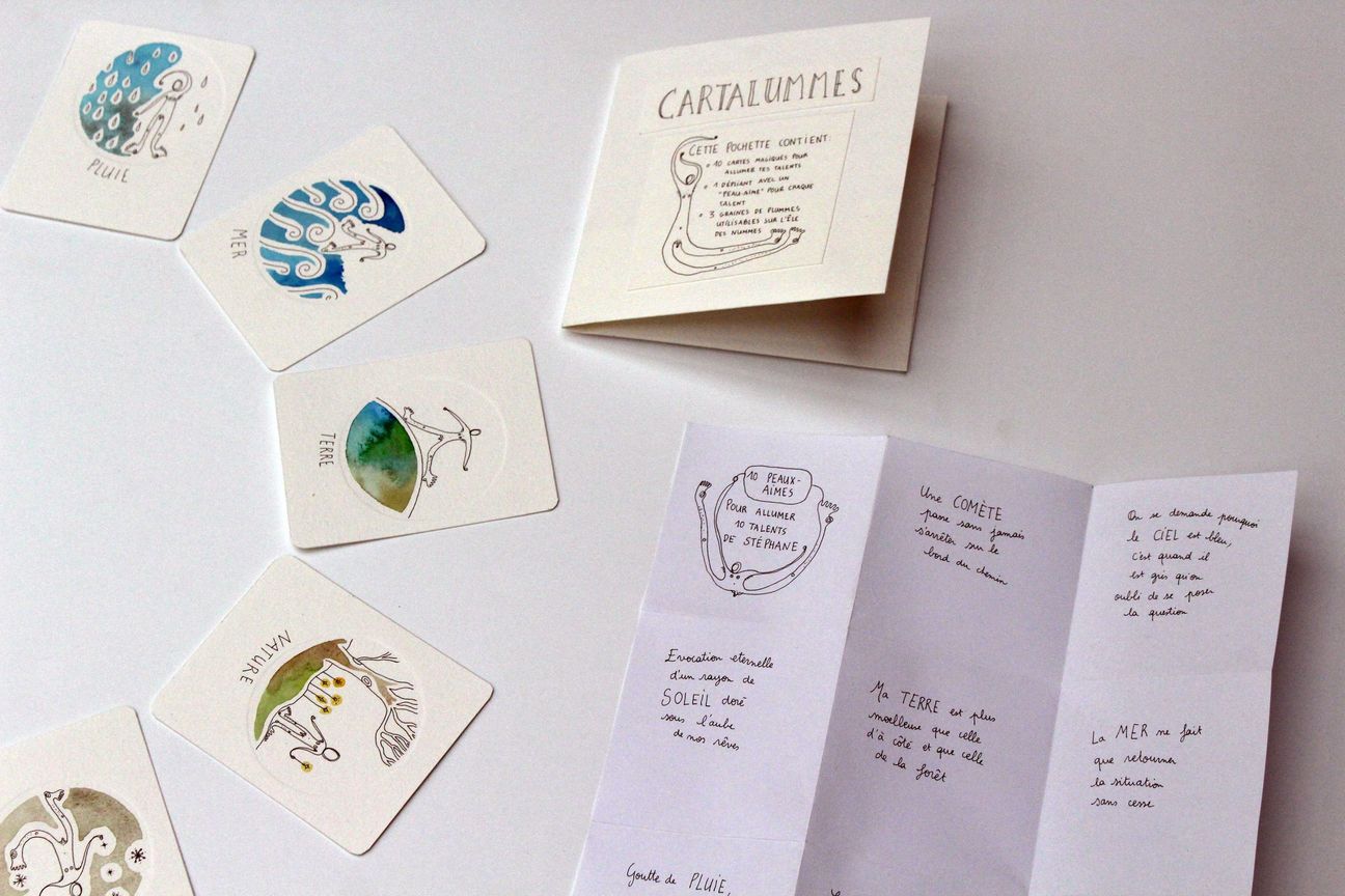 Avec les Nummes on a un peu changé notre manière de travailler, maintenant on écrit un Peau-Aime pour chaque « mot/talent » ! C’est plus rigolo ! Si toi aussi tu veux des Cartalummes personalisées pour toi ou pour quelqu’un, dis-nous, ça coute 50 graines de plummes (frais de ports compris) (= 50€ pour les humain.e.s)