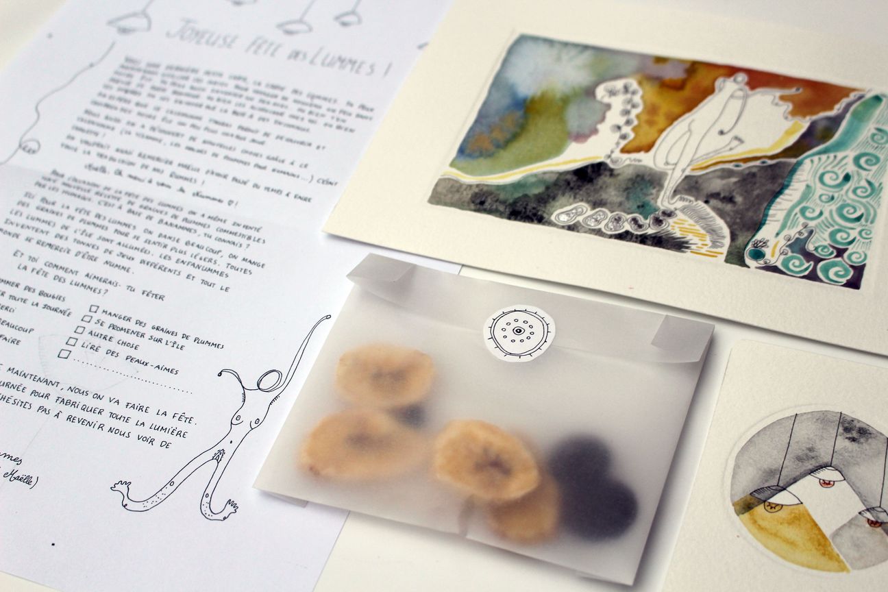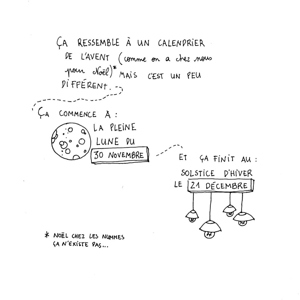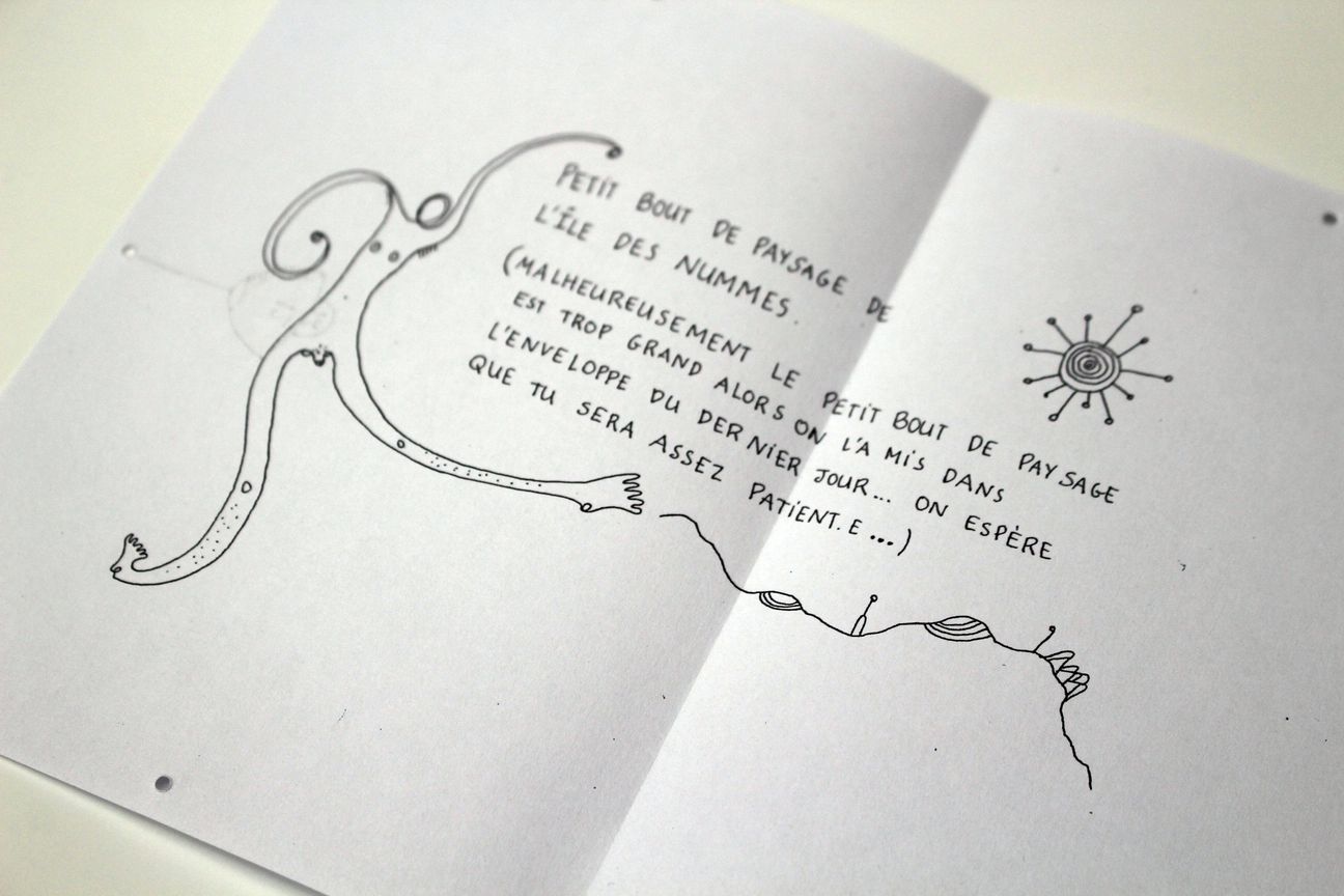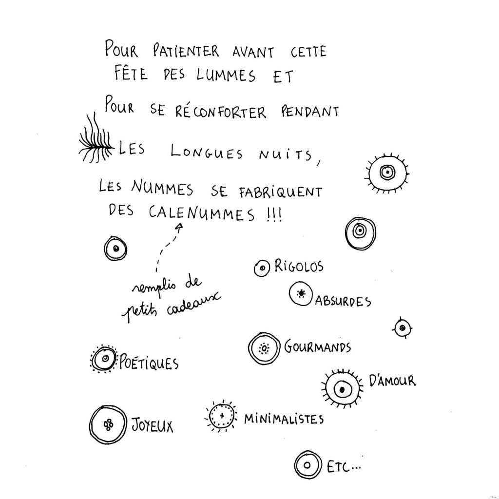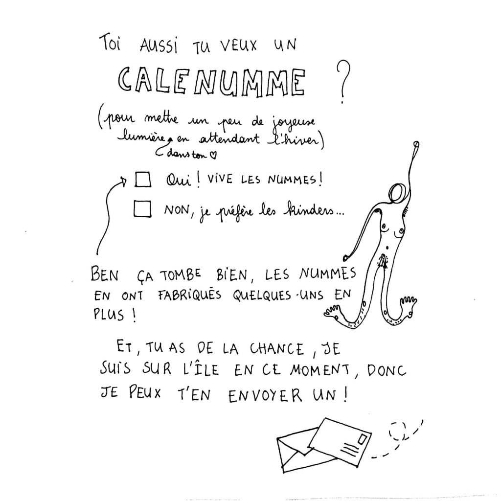 Pour patienter jusqu’à cette fête et pour mettre un peu plus de lummière dans nos journées pendant cette période, les Nummes et moi-même avons confectionné des « Calenummes » remplis de trésors, d’absurdité et de poésie. Entre le 30 novembre (jour de pleine Lune) et le 21 décembre, 10 humain.e.s/foyers/familles ont pu voyager eux aussi et découvrir un peu plus cette île extraordinaire.