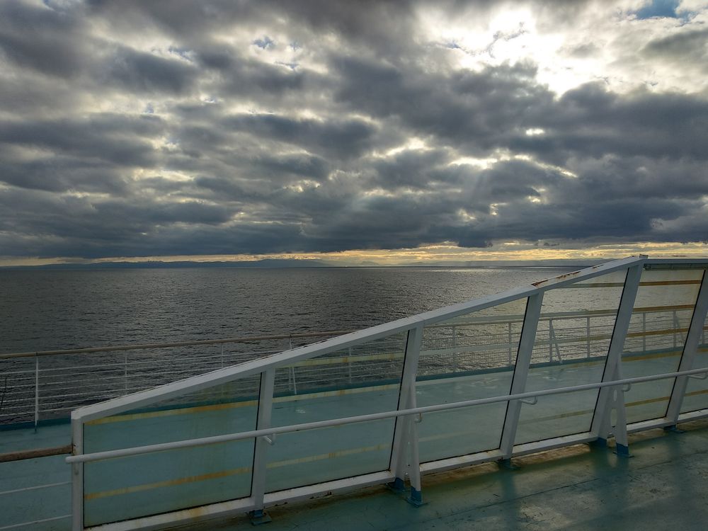 Je suis un peu perdue pour retrouver l’endroit où j’ai laissé mon vélo, je passe dans de grandes cales vides tout en bas. Je prends des ascenseurs. J’essaye de comprendre ce qui est écrit sur le ticket que l’on m’a donné hier en arrivant dans le bateau. Je demande ma route. Puis je remonte et retrouve le chemin vers mon fidèle destrier.