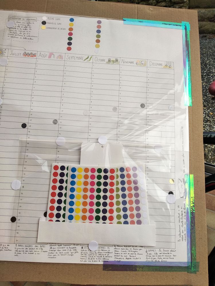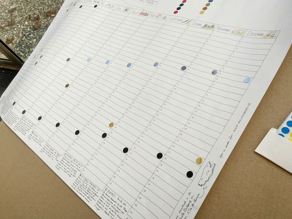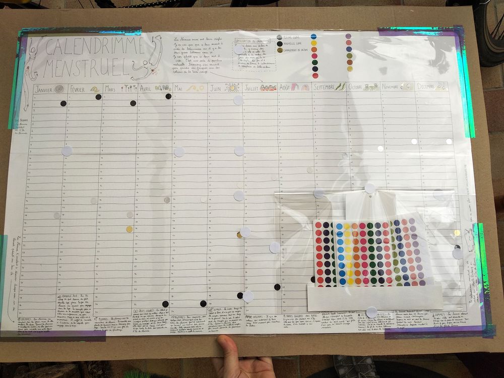Voici un calendrimme menstruel adapté aux humain.e.s sur lequel chaque personne qui veut participer peut indiquer aux autres le moment de ses règles via une gommette de couleur. Au fur et à mesure de l’année, le calendrimme se remplira de couleurs et peut-être que les personnes qui passeront devant se sentiront un peu plus légères sur leur rapport aux règles 🙂