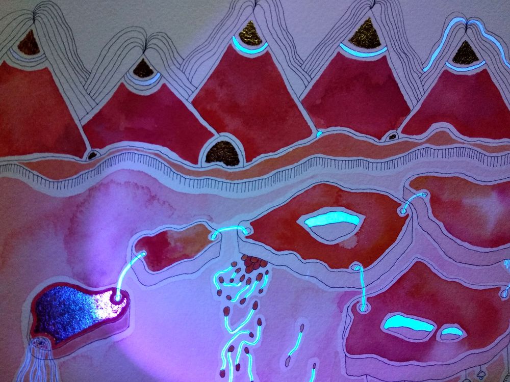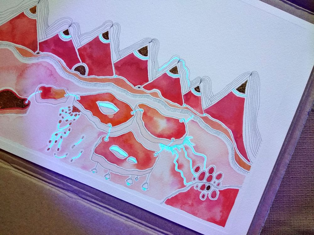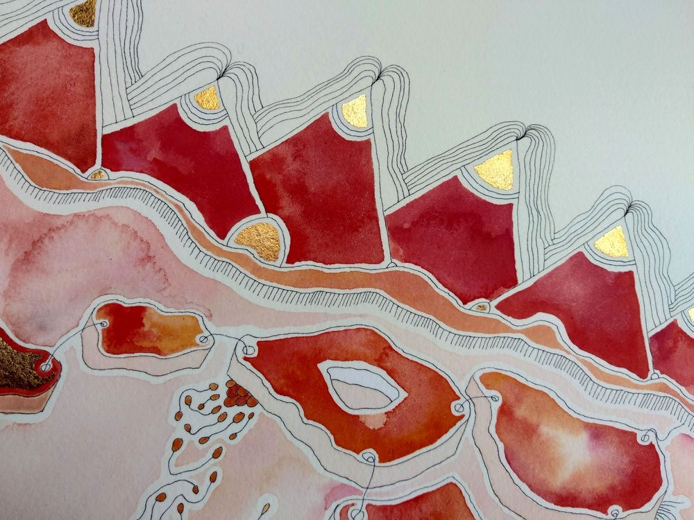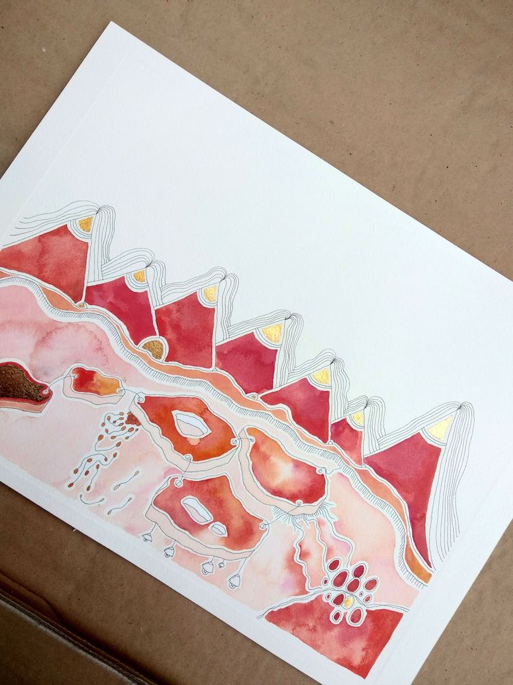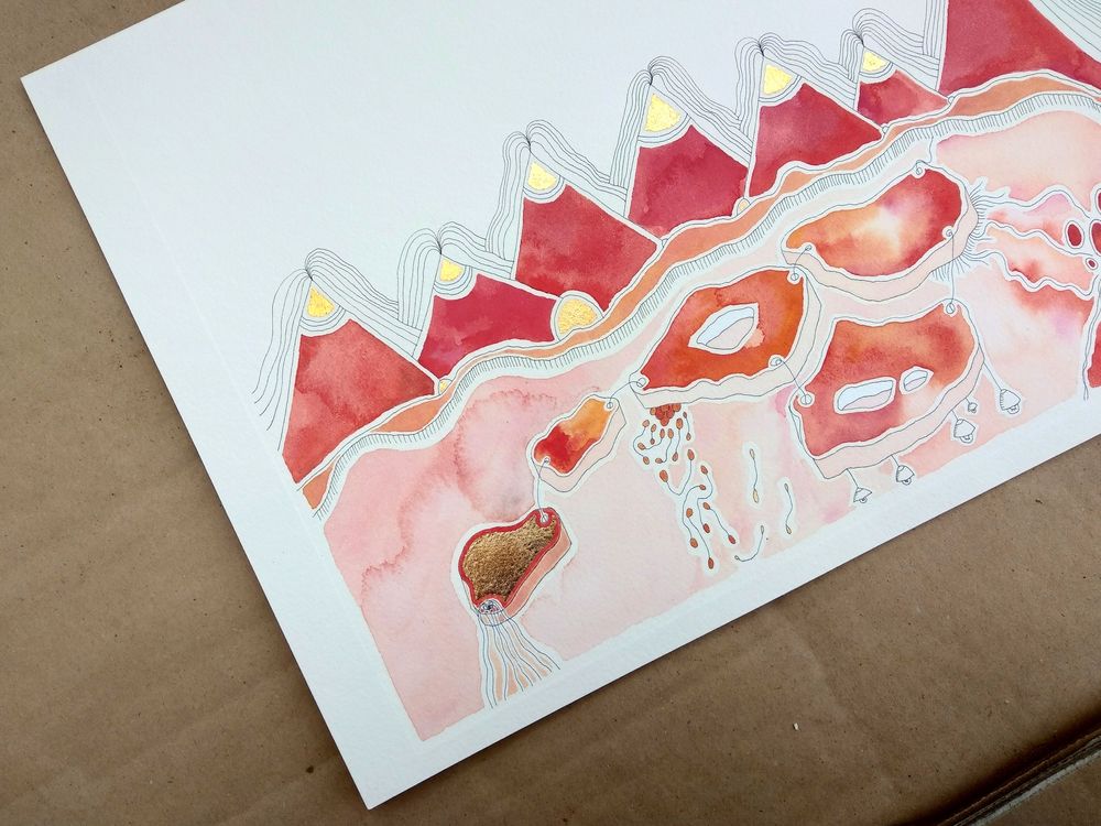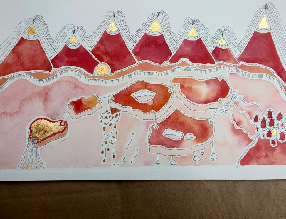 Aquarelle, encre de chine, feuille à dorer sur papier aquarelle Arches, 26x36cm, printemps 2021