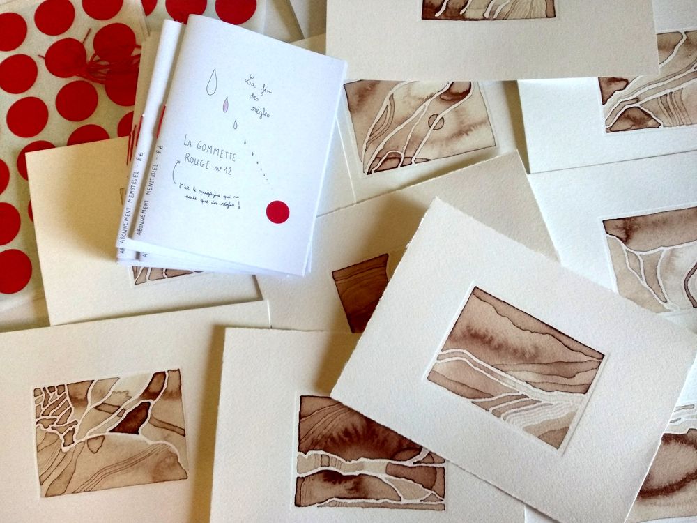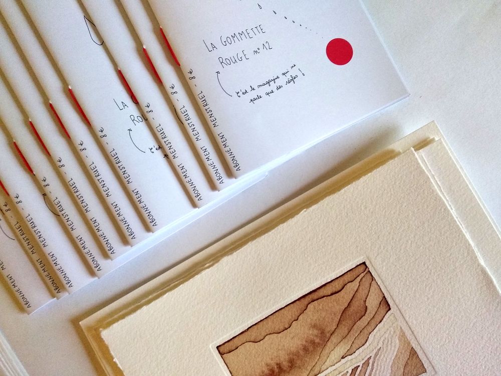 Le numéro 12, le dernier numéro !! C’est la fin de cet abonnement sur lequel je m’étais engagée sur 12 cycles. Ce projet a duré un peu plus longtemps que prévu de part mes cycles à rallonge de l’an dernier. Je suis très heureuse d’être allée au bout de ces 12 numéros, les derniers ont étés assez compliqués à produire pour moi, je n’avais plus autant d’élan et de motivation qu’au début pour me remettre à chaque cycle dans La Gommette Rouge… Je me suis rendue compte au fur et à mesure que c’était tout de même énormément de travail pour une seule personne… Je ne sais pas encore ce que sera la suite de ces histoires de règles, mais je sens que j’ai l’envie de partager ce projet avec d’autres personnes qui pourraient être intéressées par la création d’un magazine menstruel. Si tu te sens attirée par cette idée écris-moi ! (Les hommes vous êtes bienvenus aussi, ce n’est pas réservé aux femmes)