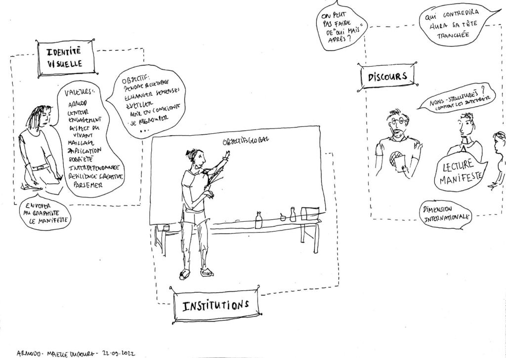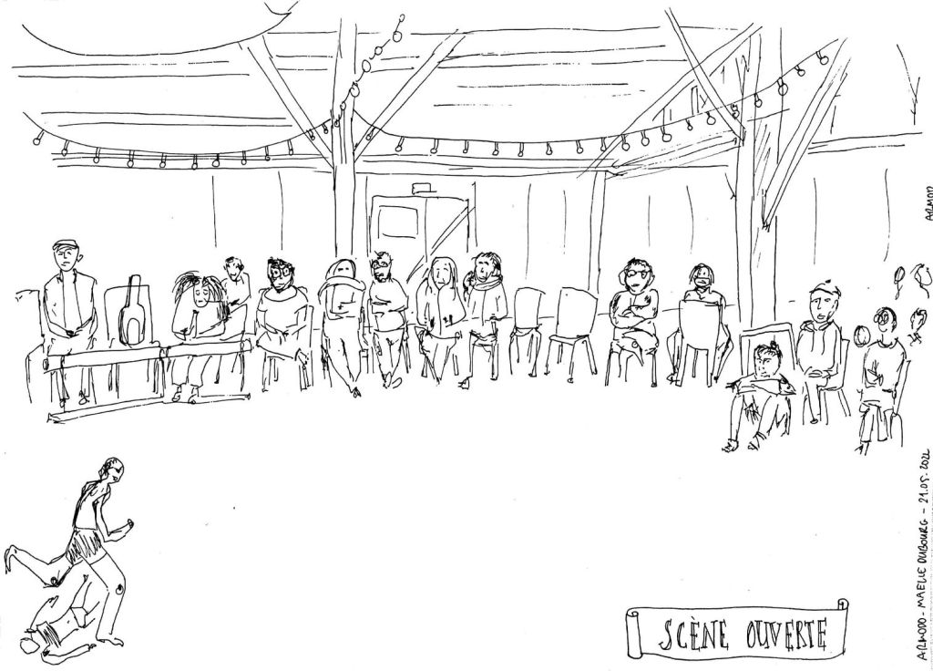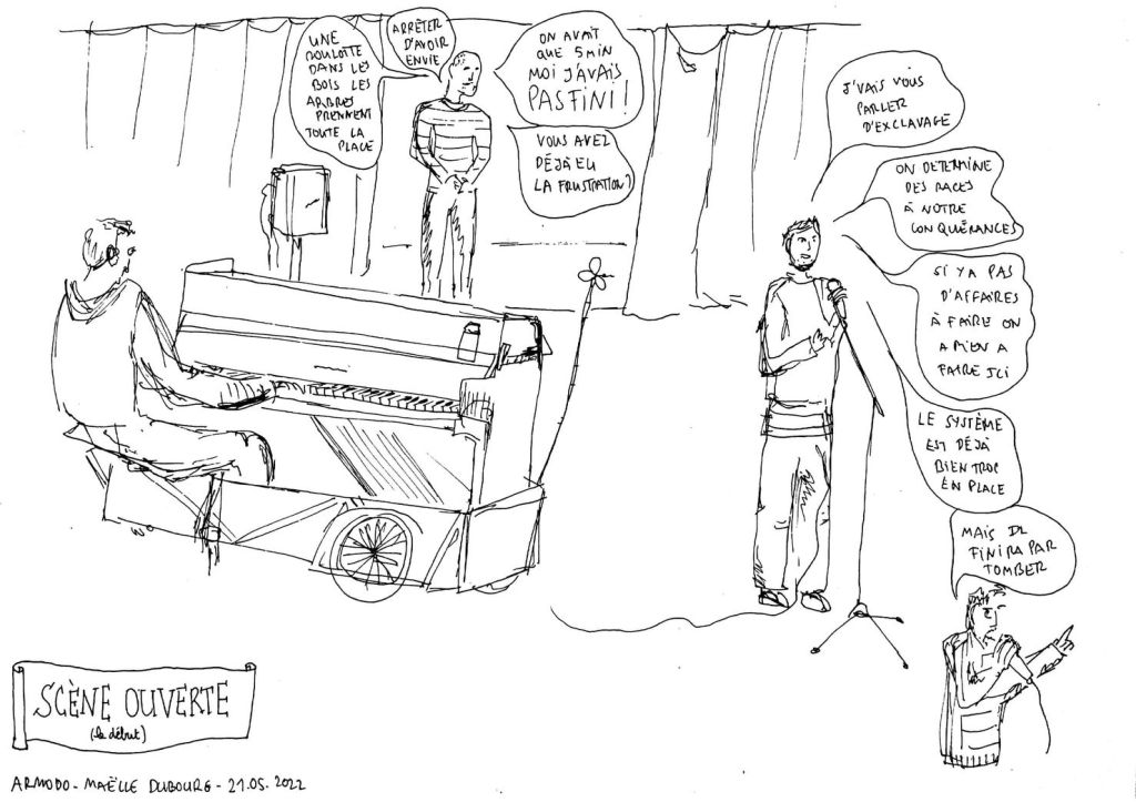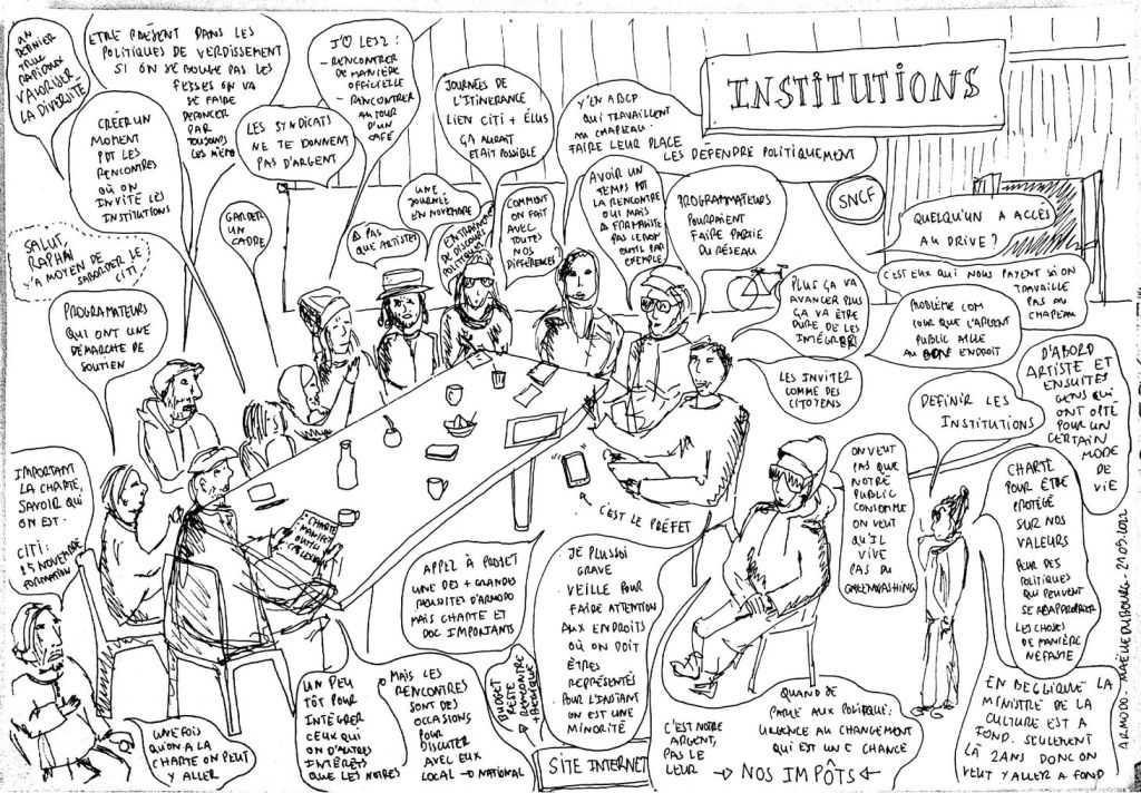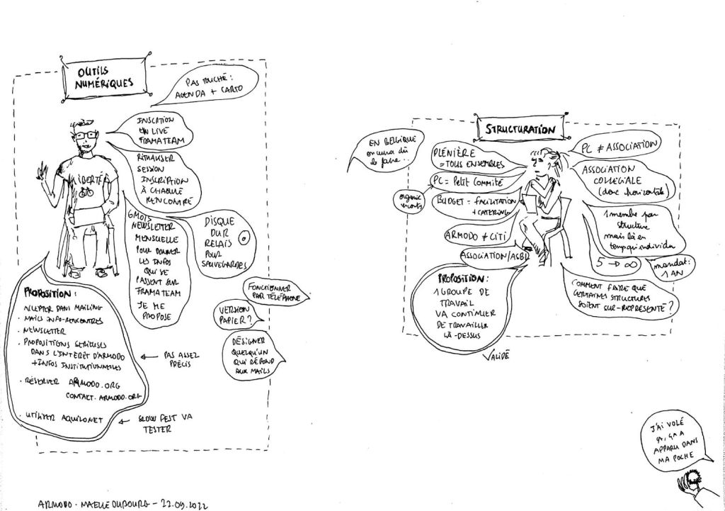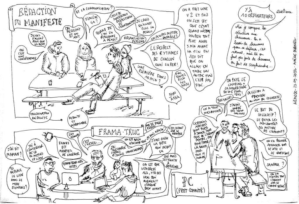 Je ne sais pas trop ce qui m’a pris de commencer à dessiner ce qu’il se passait sous mes yeux lors de la première plénière, puis la deuxième. Des personnes sont venues me voir pour me demander si elles pouvaient regarder mes dessins. Je ne m’attendais pas à tant d’enthousiasme devant des crobars sur demies feuilles A4 déchirées…