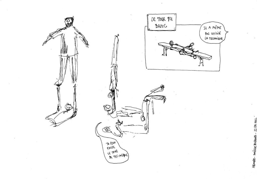 Mais, ça m’a amusé et c’était assez chouette de me remettre à un dessin d’observation que je ne pratiquais plus depuis longtemps. Alors j’ai continué toute la semaine. Croquer les scènes, annoter les petites phrases drôles et moments comiques, mais aussi prendre note plus sérieusement des discussions.