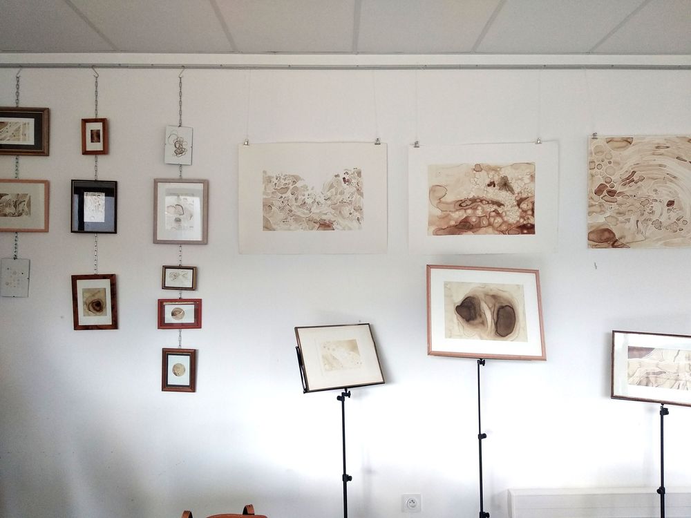 « On dirait que une personne a pris du café pour faire de gros tableau mais il a laissé des parties blanches et je trouve ça original. Le 2eme tableau ressemble à une lune le 3eme tableau ressemble a une barrière en paille, le 4eme tableau me fait penser à un chien.