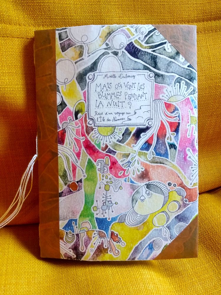 C’est un livre relié et doré à la main, il est imprimé en seulement 30 exemplaires, il contient un paysage unique, une lumme à l’envers, des peaux-aimes à découper, des graines de plummes, des fautes d’orthographe, des secrets de l’Île des Nummes jamais révélés à personne.