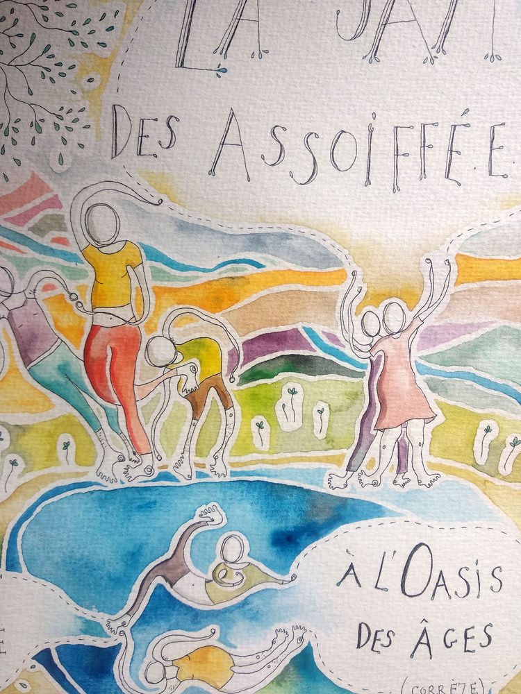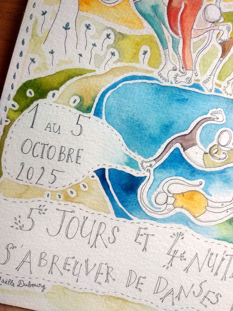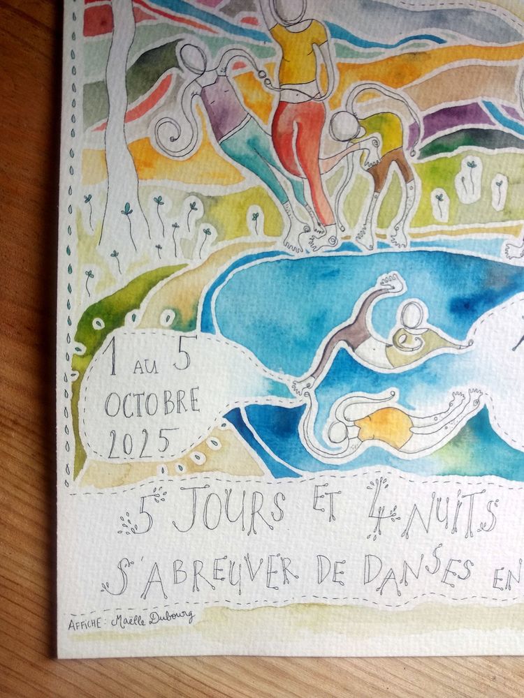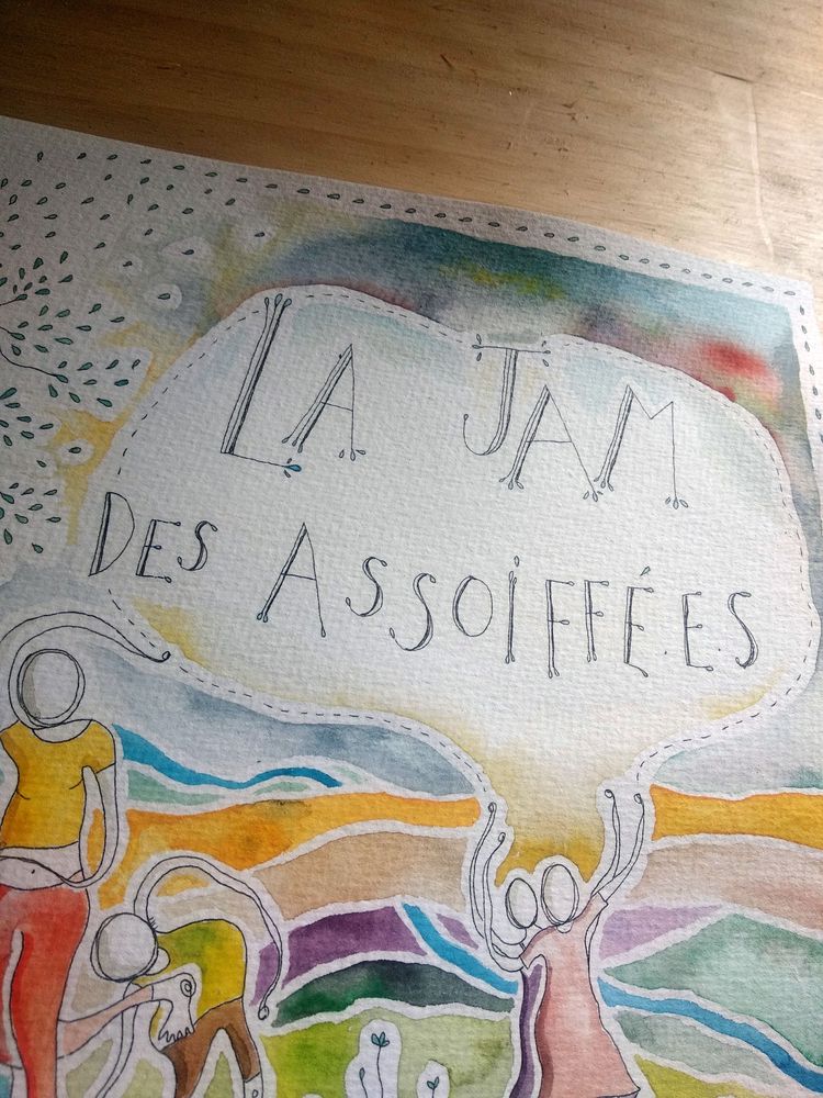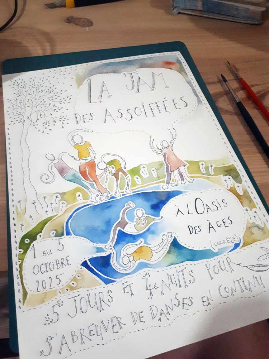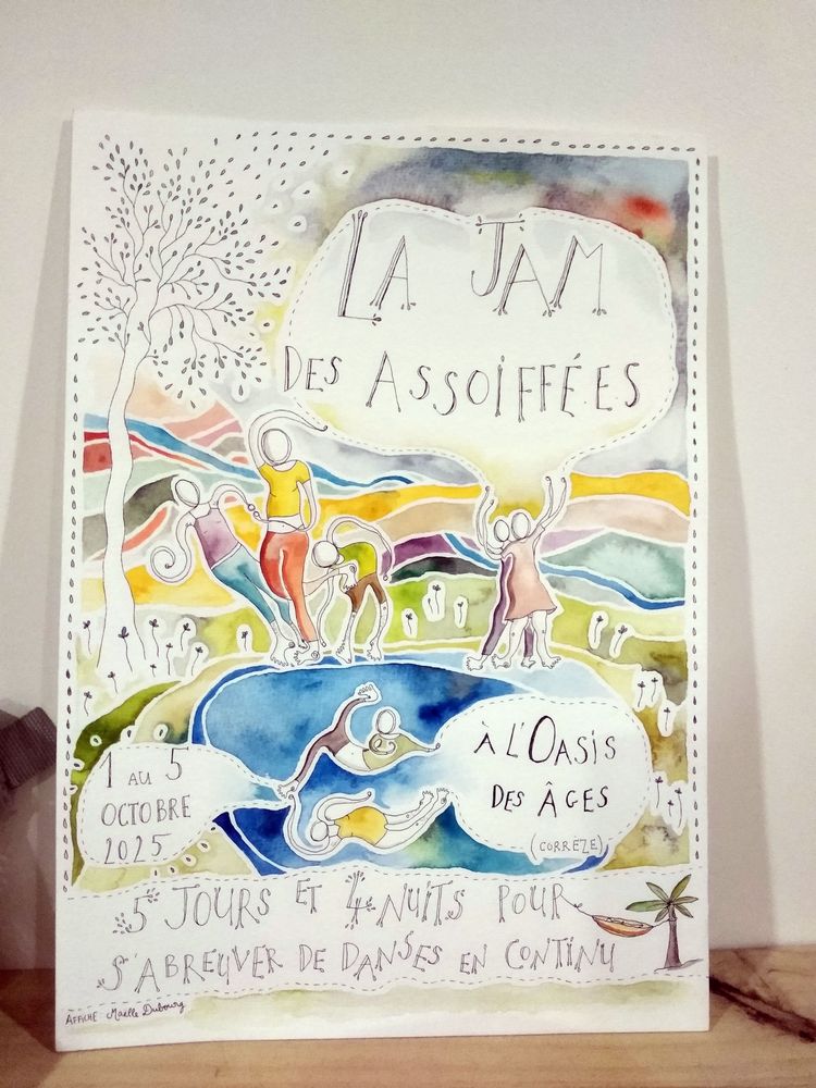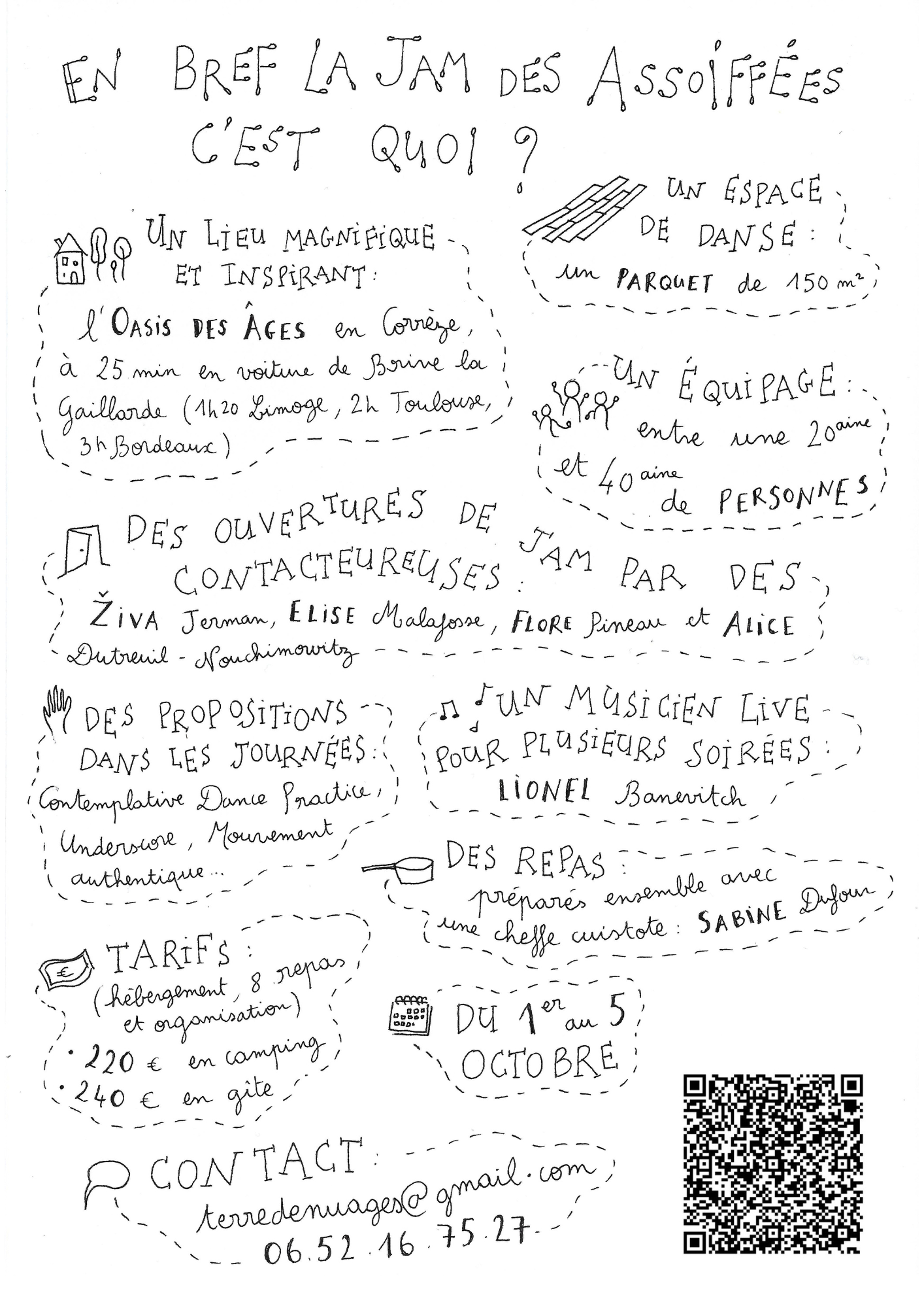 Affiche / Flyer pour La Jam des Assoiffé.e.s (festival de danse contact improvisation) organisé par la danseuse Flore Pineau.